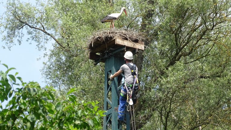 Die Beringung der Jungstörche organisierte Ingrid Dorner im Auftrag der Vogelwarte Radolfzell. Stefan Schäfgen, Freileitungsmonteur des Energieversorgers Amprion, übernahm die Beringung im Storchennest. Der 31-Jährige kletterte am Strommast hoch und brachte die Identifikationsringe bei den Jungstörchen an. „Mit der Beringung der Jungvögel können wir uns ein Bild der Populationsentwicklung und der Ausbreitung des Weißstorchs in Rheinland-Pfalz machen“, erklärt Ingrid Dorner. „Deshalb begrüßen wir die gute Zusammenarbeit mit dem LJV.“